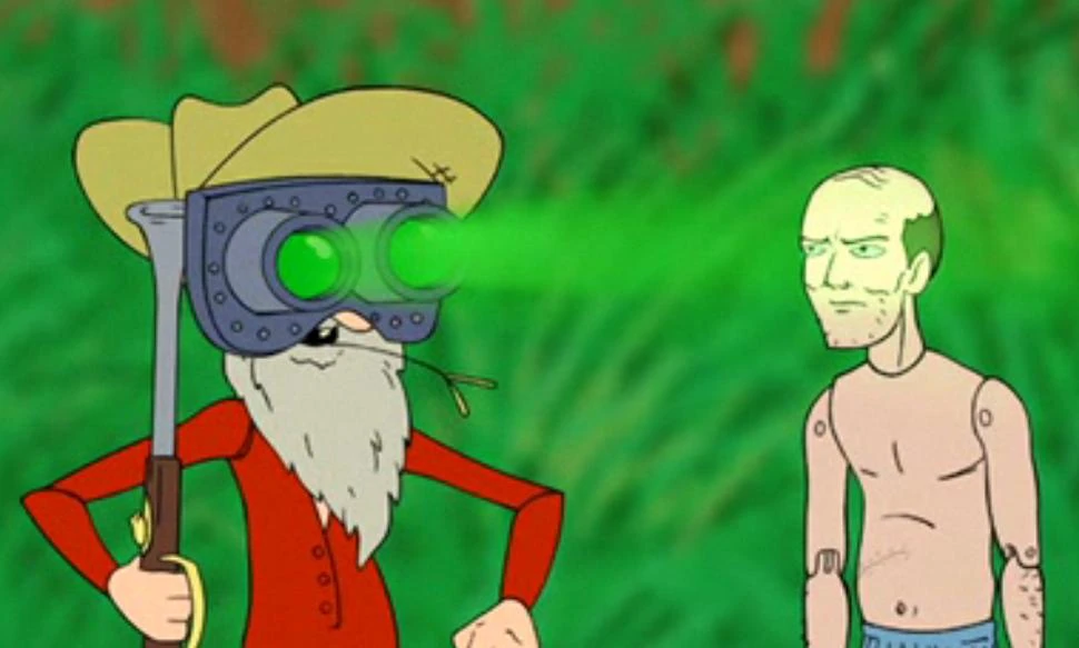 Jiggle Billy was first seen in Dumber Dolls as a toy Meatwad wanted Frylock to buy for him. His $149.95 price tag (apparently having something to do with his "expensive night vision goggles - for night jiggling!") caused Frylock to buy Meatwad Happy Time Harry instead, whose nihilistic, suicidal demeanor and surly attitude eventually made Meatwad depressed and bitter, prompting Frylock to splurge and buy Jiggle Billy in an attempt to improve Meatwad's attitude. By this point, it's already too late, as Happy Time Harry promptly begins mocking and berating Jiggle Billy, making him depressed too, forcing him to admit he "doesn't know why [he] has these goggles" and culminating in him shooting his head off with his blunderbuss in a suicide attempt, which he survives apparently no worse for the experience except for still being "real depressed".